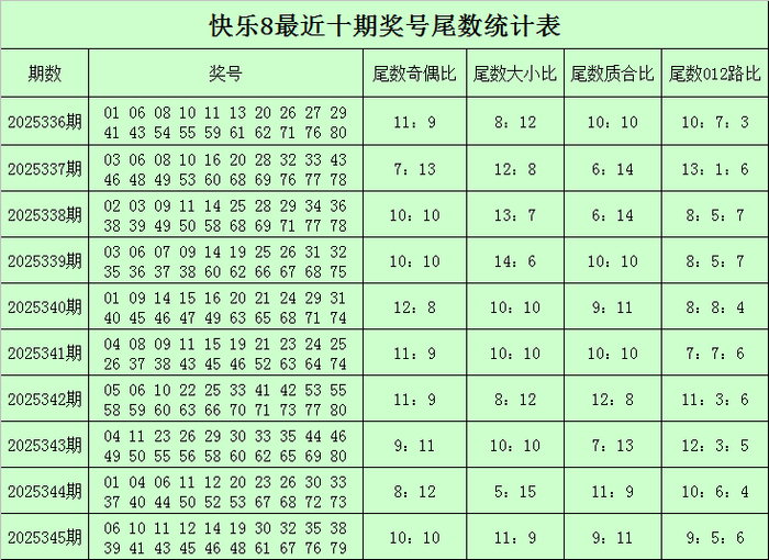福彩快乐8第2025345期开奖回顾:06 10 11 12 14 19 30 32 35 38 39 41 43 45 46 48 61 67 76 79,其中奖号尾数奇偶比为10:10,尾数012路比为9:5:6,尾数大小比为11:9,尾数质合比为9:11。